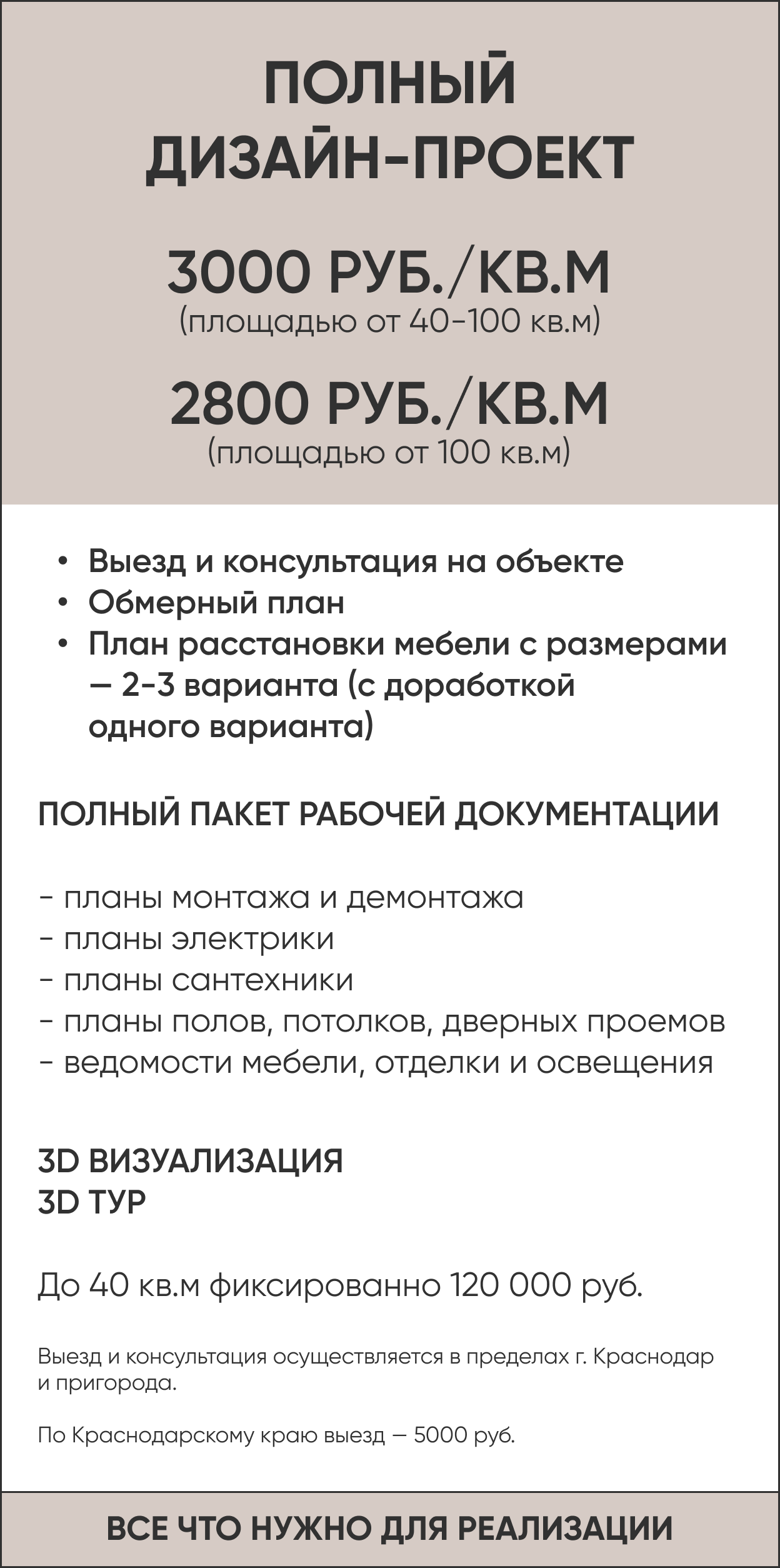 Я со своей командой разрабатываю уникальные дизайн-проекты для квартир и домов, создаю фотореалистичные визуализации и 3D-туры, подготавливаю полный комплект рабочей документации для строителей.